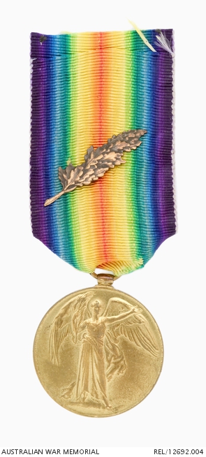 Victory Medal with oak leaves emblem attached to ribbon. C268446