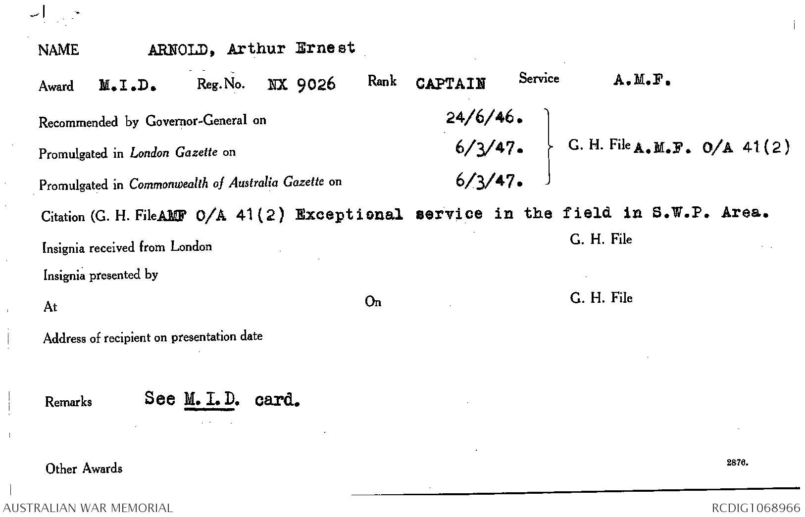 This and the Victoria Cross were the only forms of recognition for gallantry or distinguished service in action that could be made posthumously.