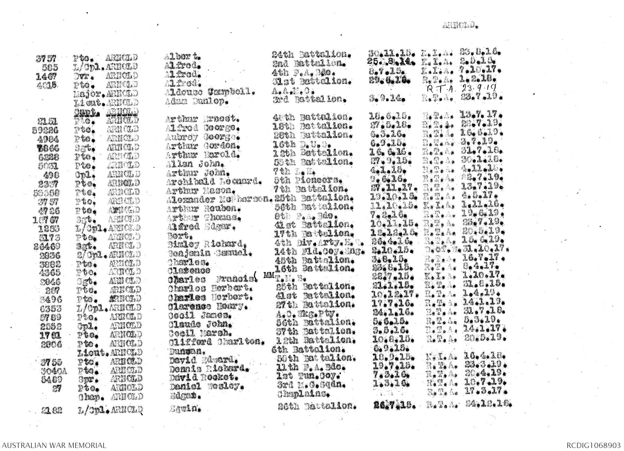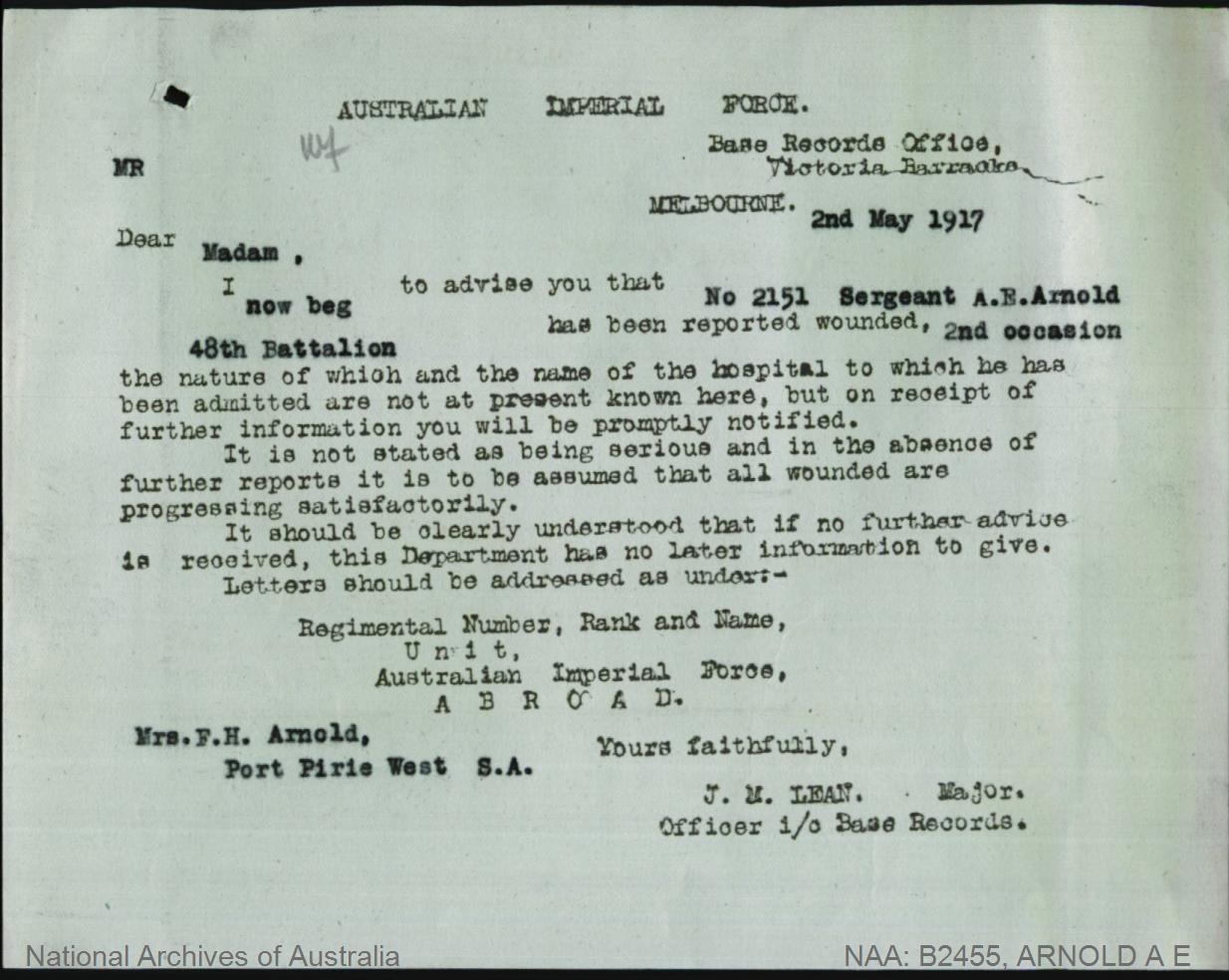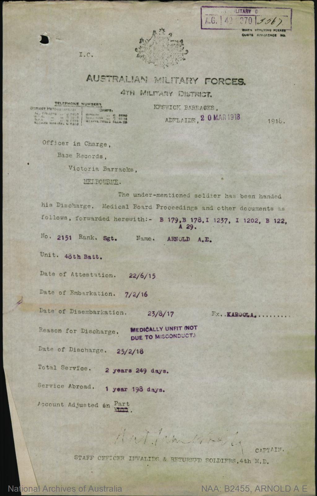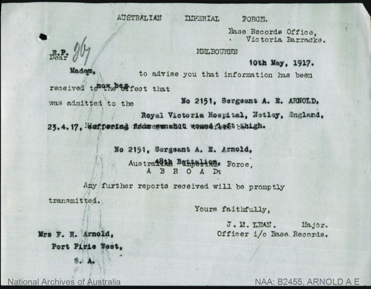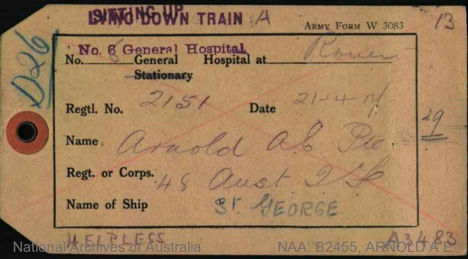 Notification that Sgt Arnold was admitted into Hospital in England.