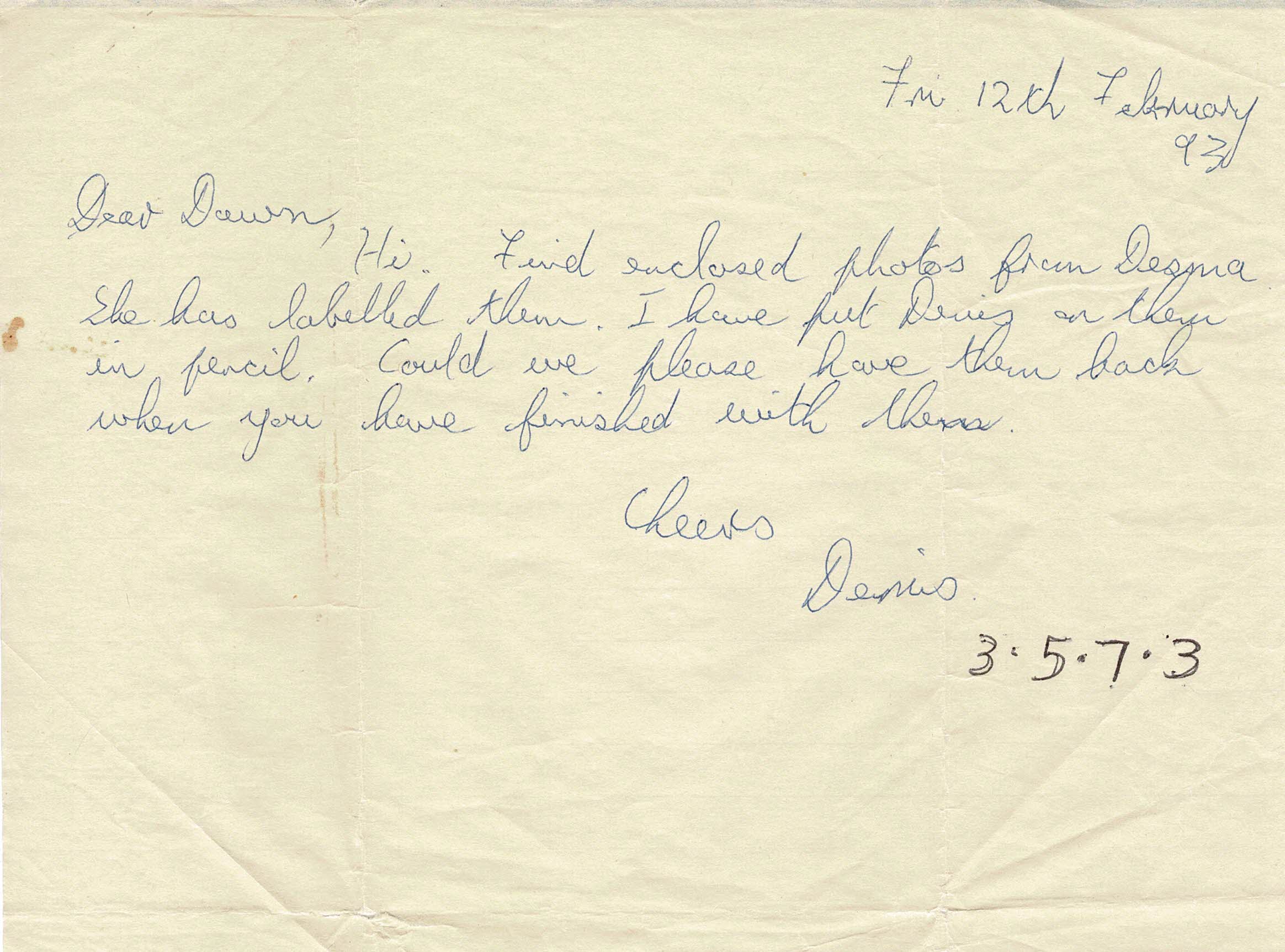 A note from 3.5.7.3 Denis Arnold to 3.5.10.1 Dawn Bowman.