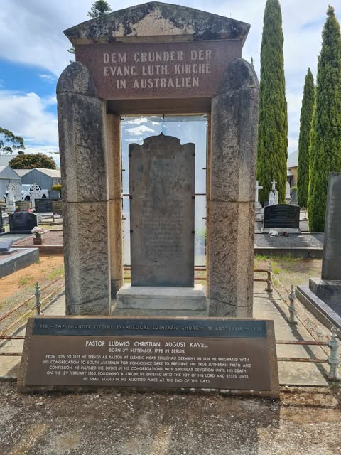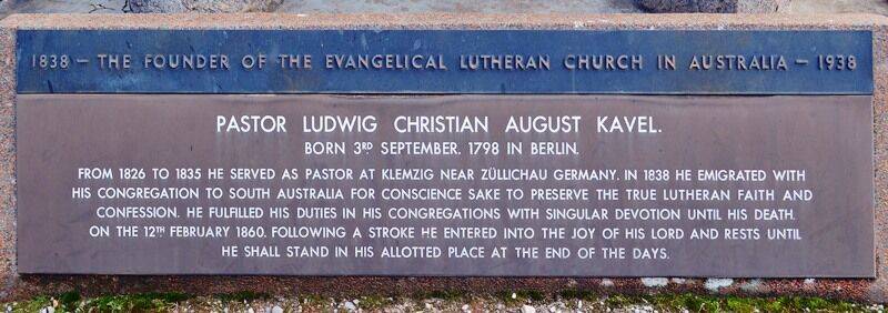 The memorial, erected over the grave, commemorates Pastor August Kavel (1798 – 1860), founder of the Lutheran Church in Australia. The monument was unveiled at the cemetery in 1938, the centenary of the landing of the landing of the first German settlers in Australia and the foundation of the Lutheran Church.