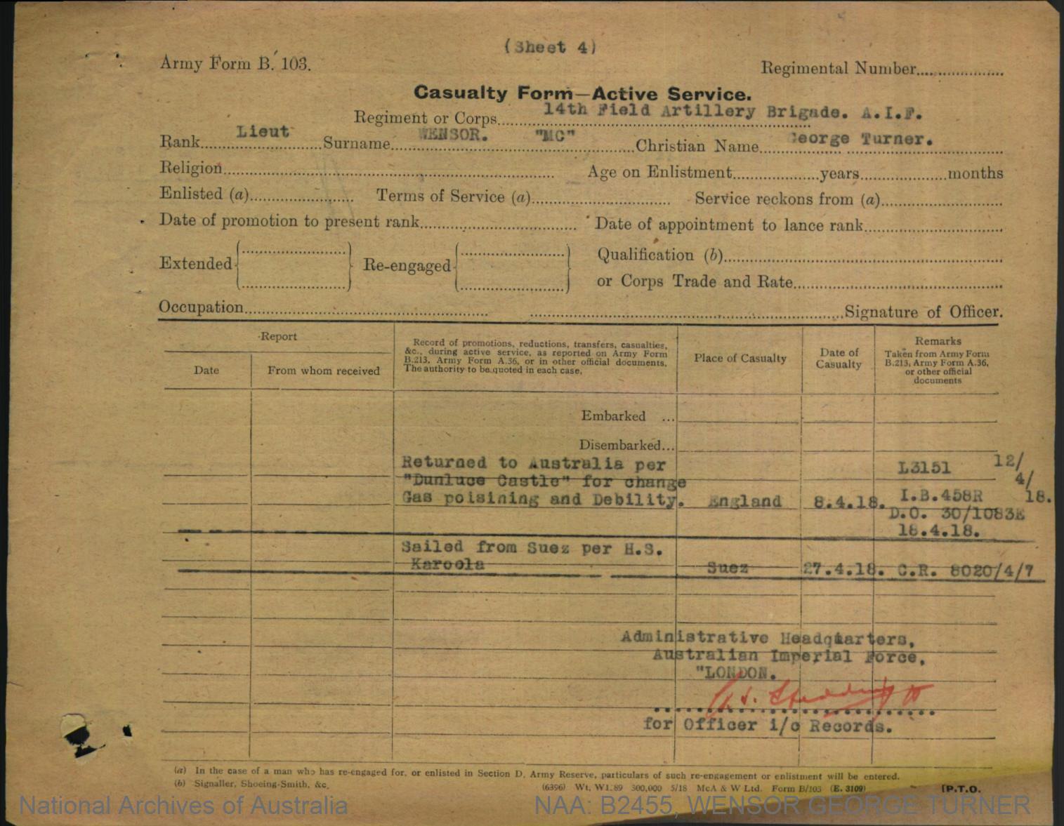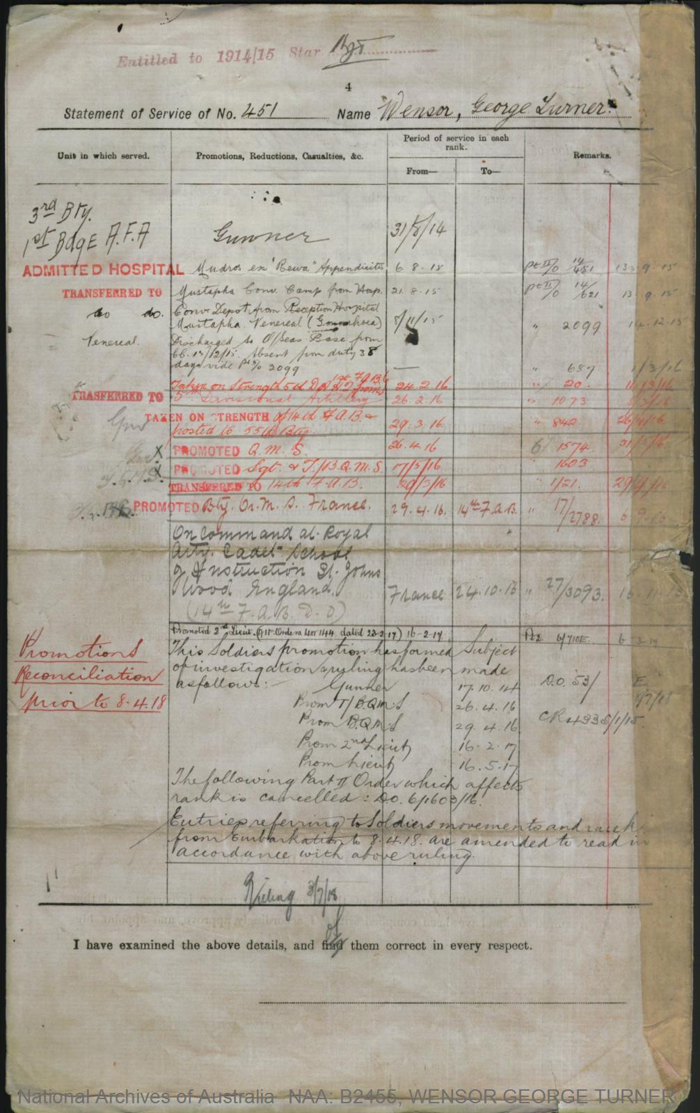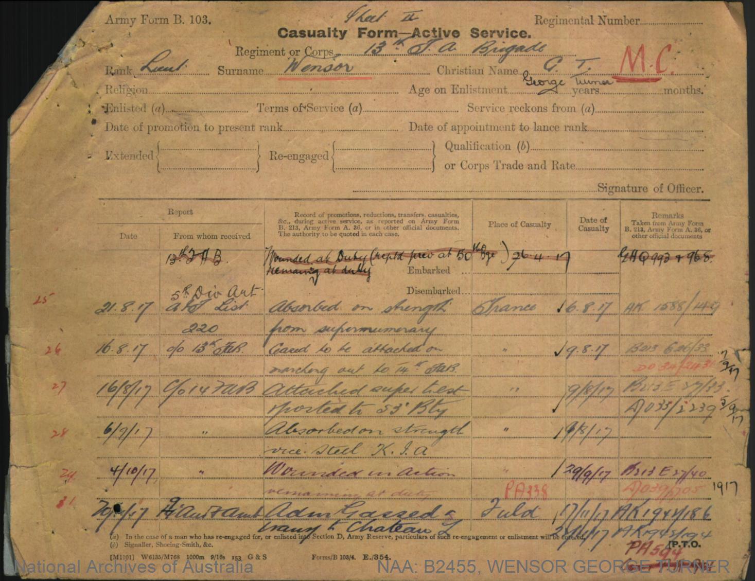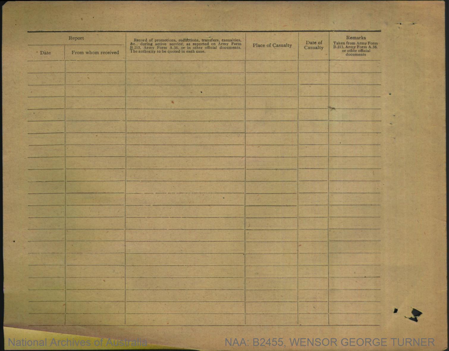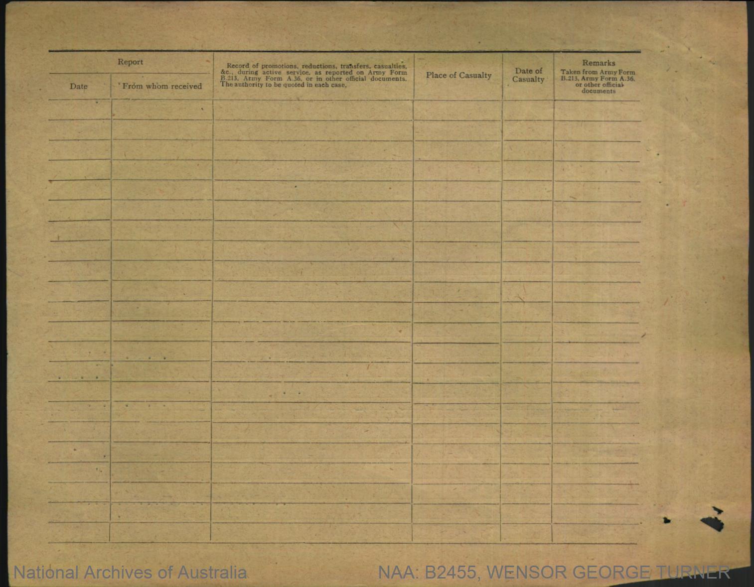 Record of Service of George Turner Wensor.