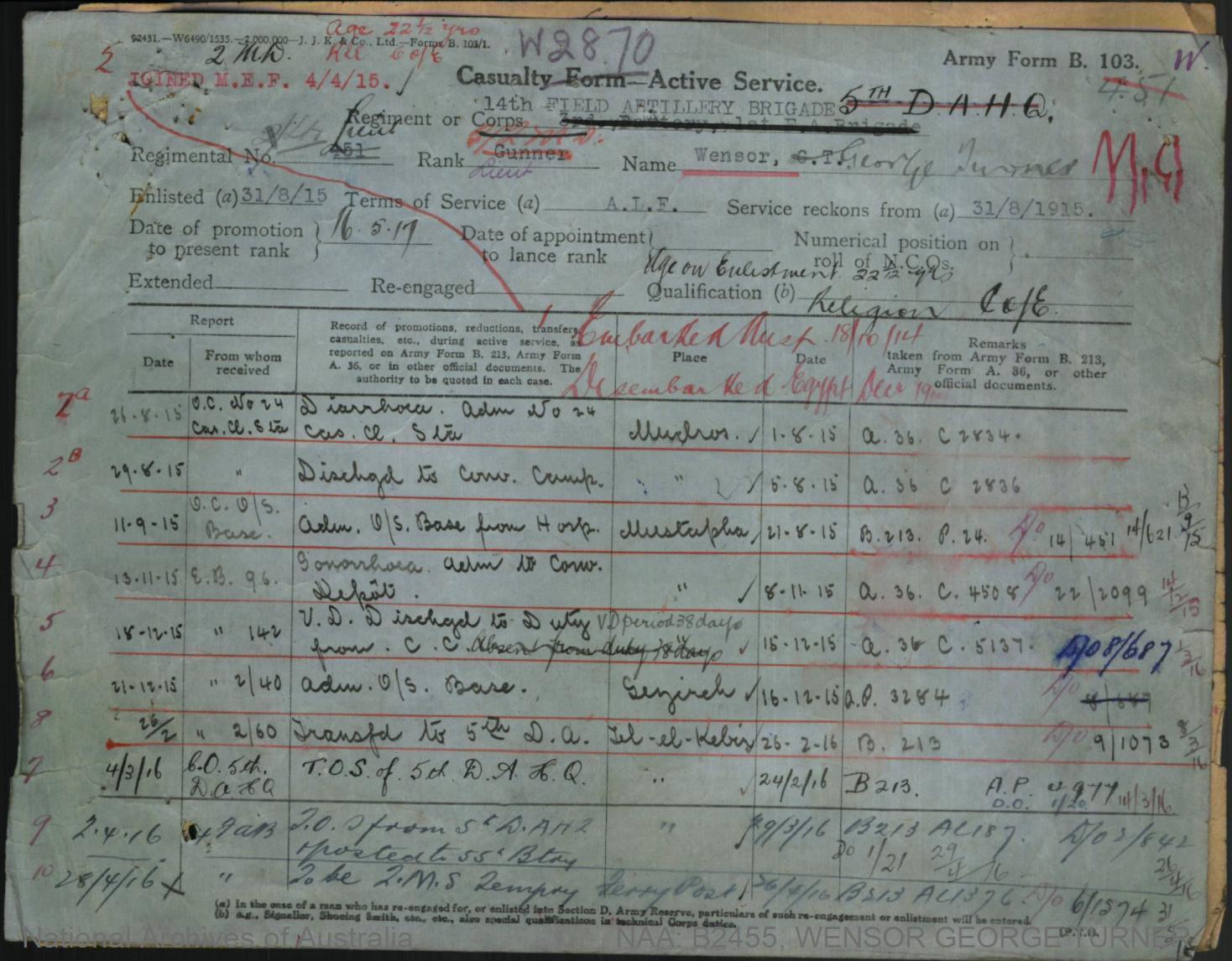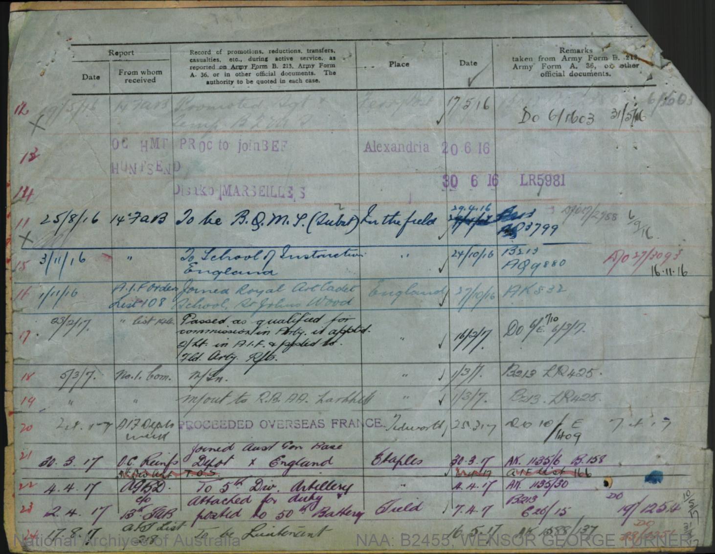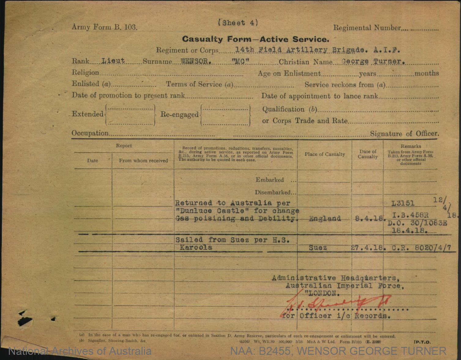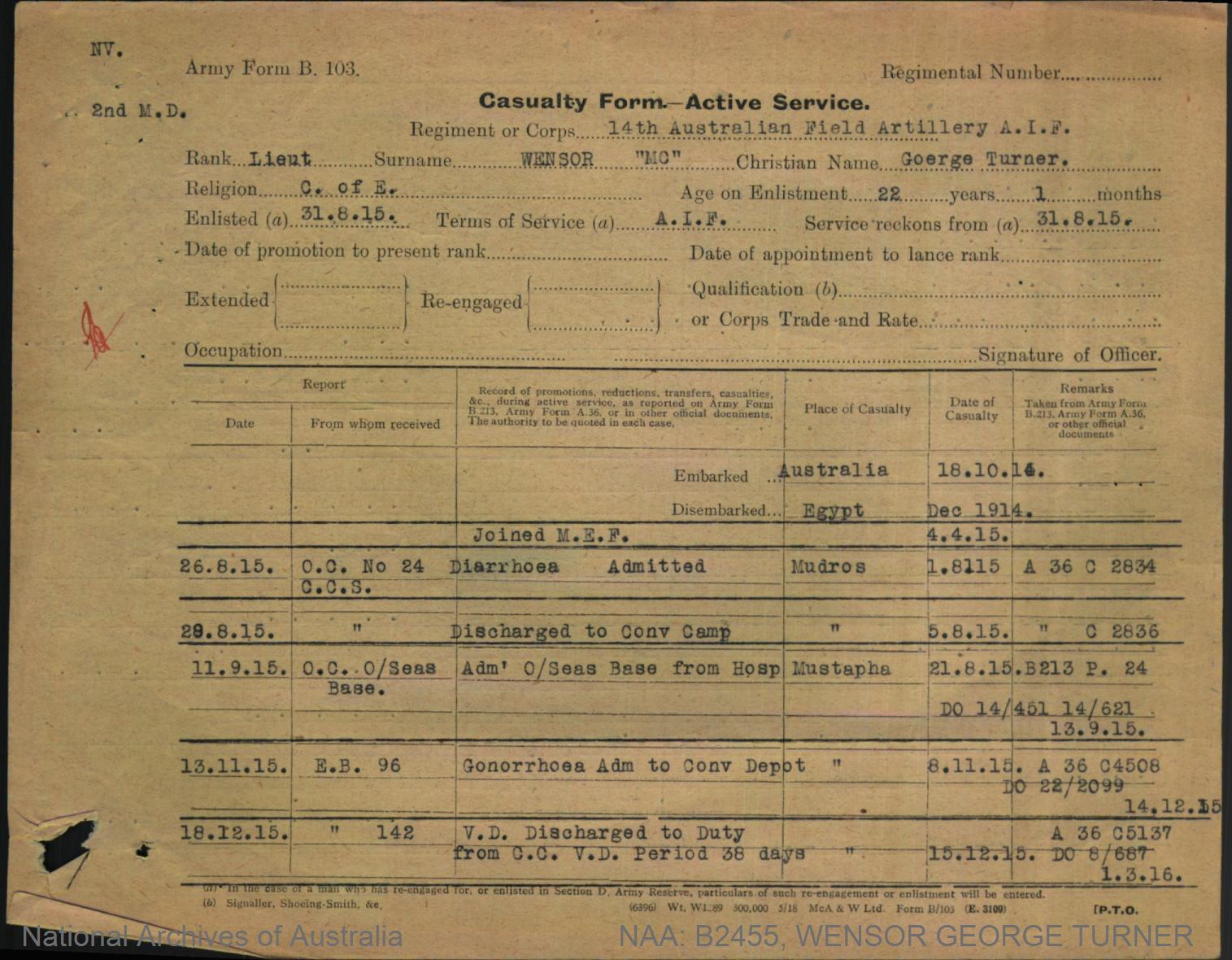Record of Service of George Turner Wensor.