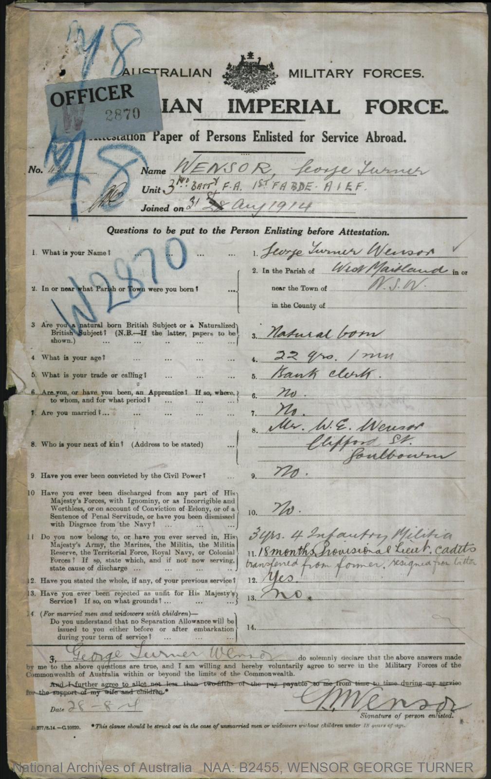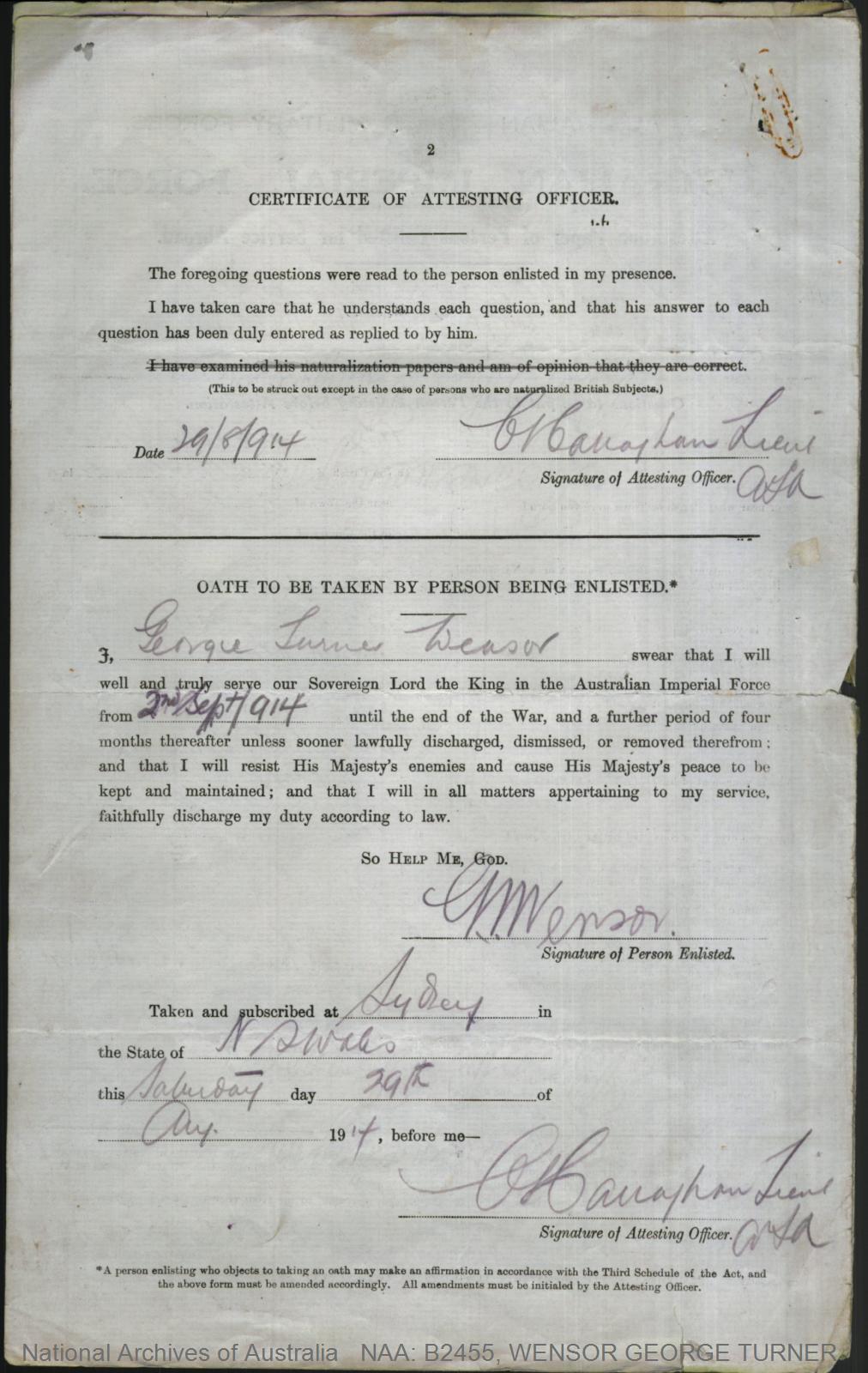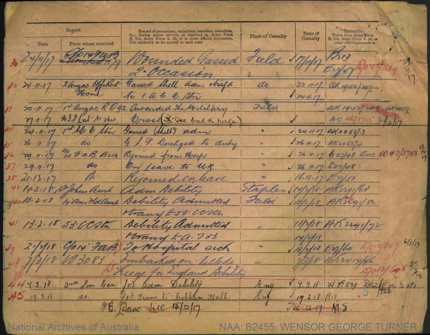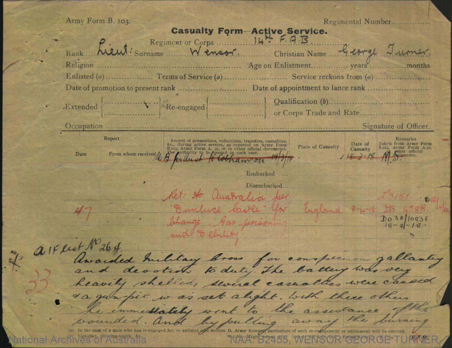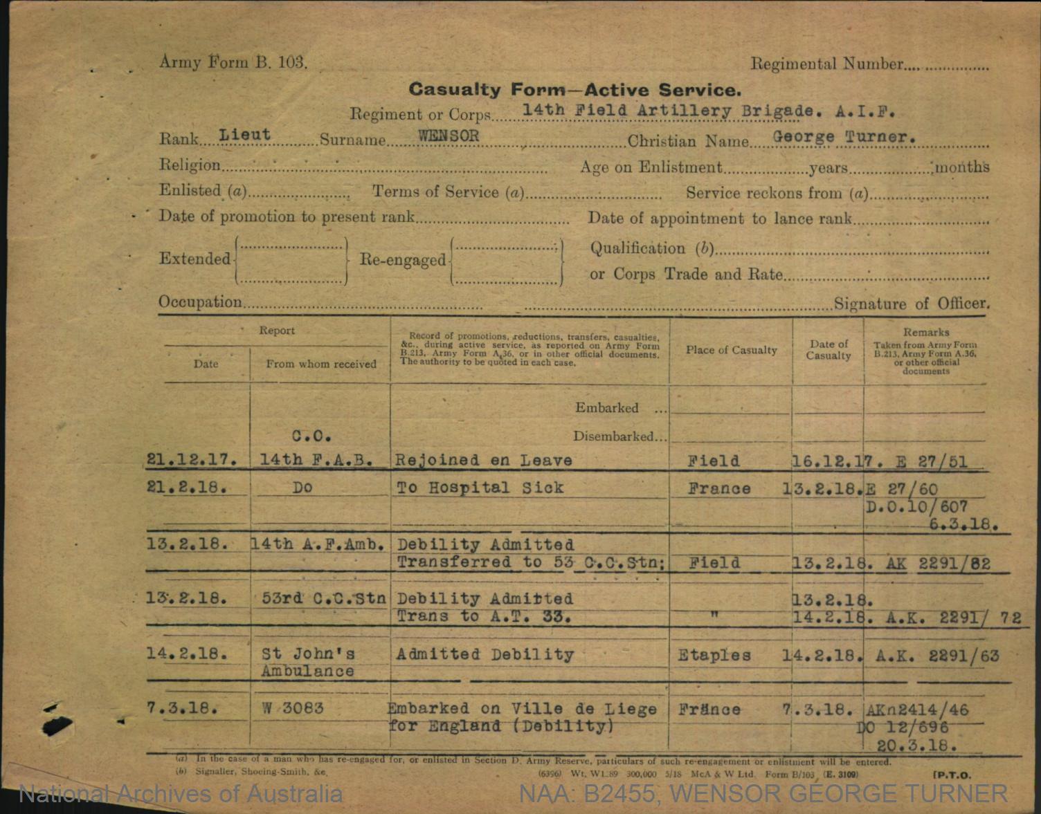Record of Service of George Turner Wensor.