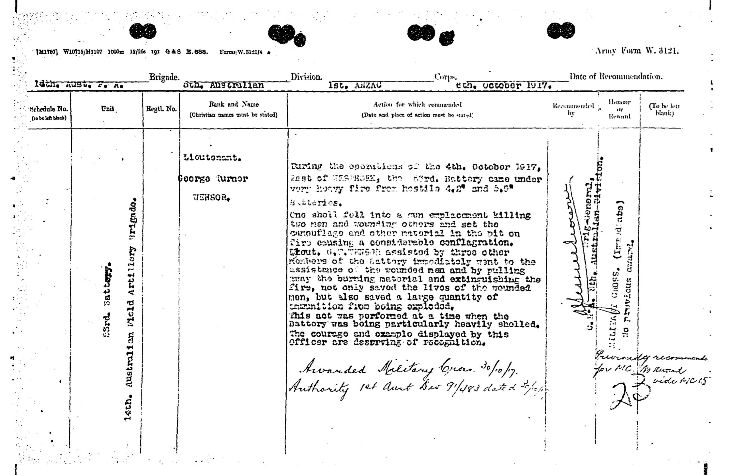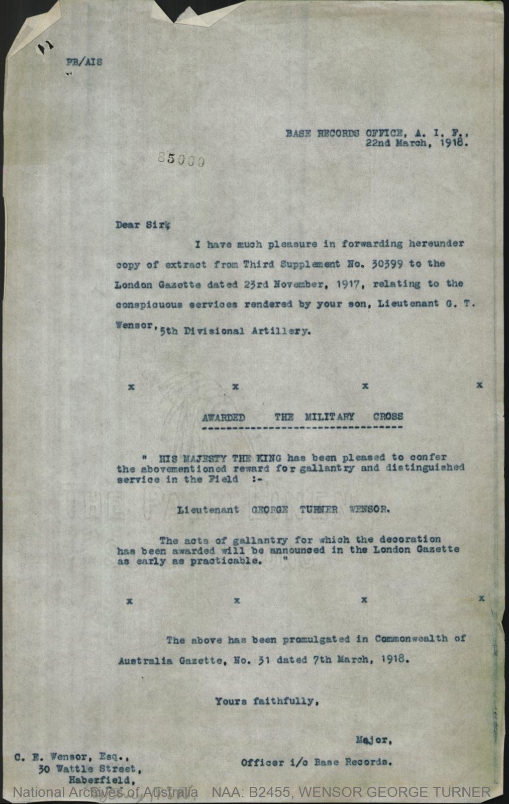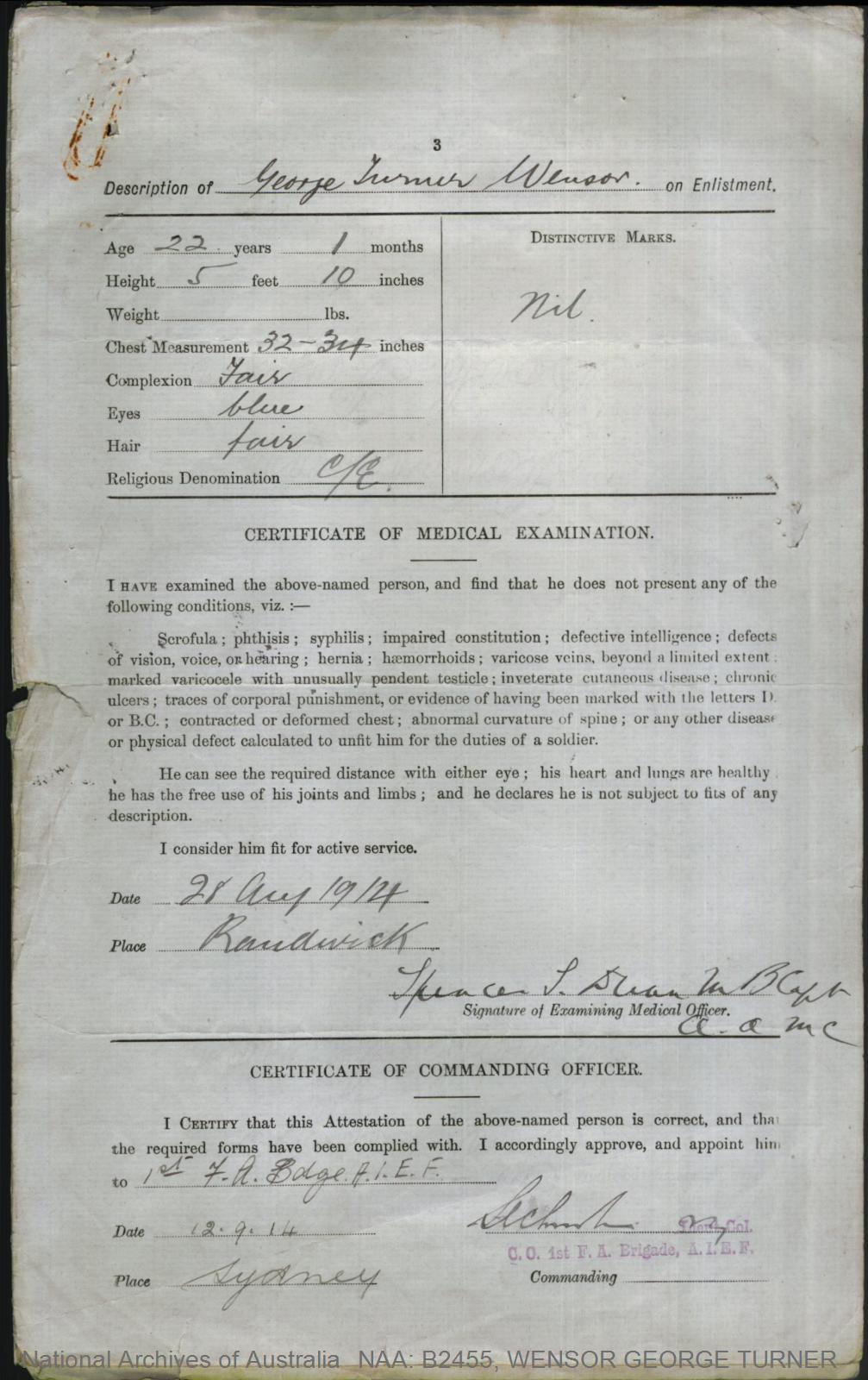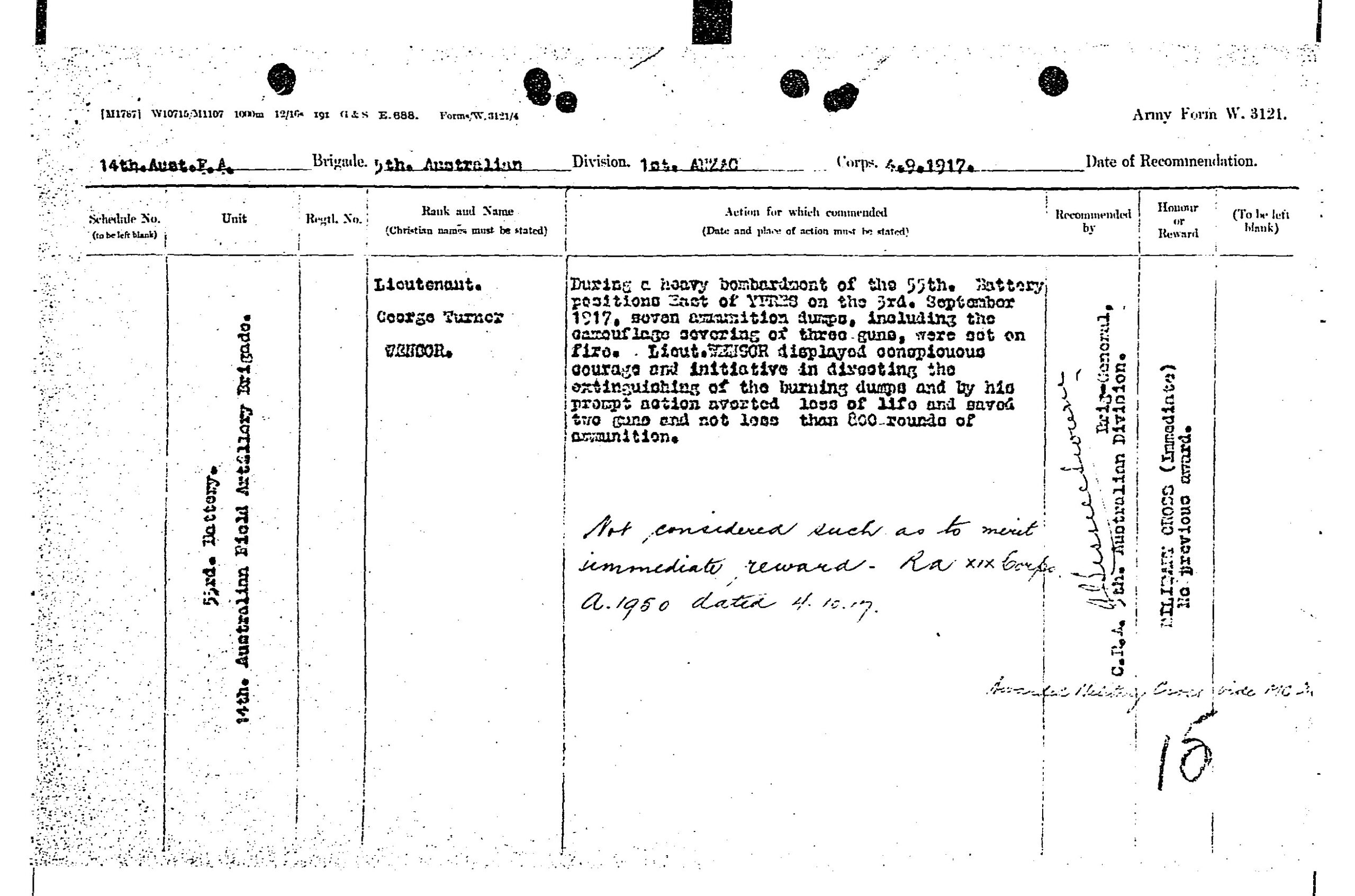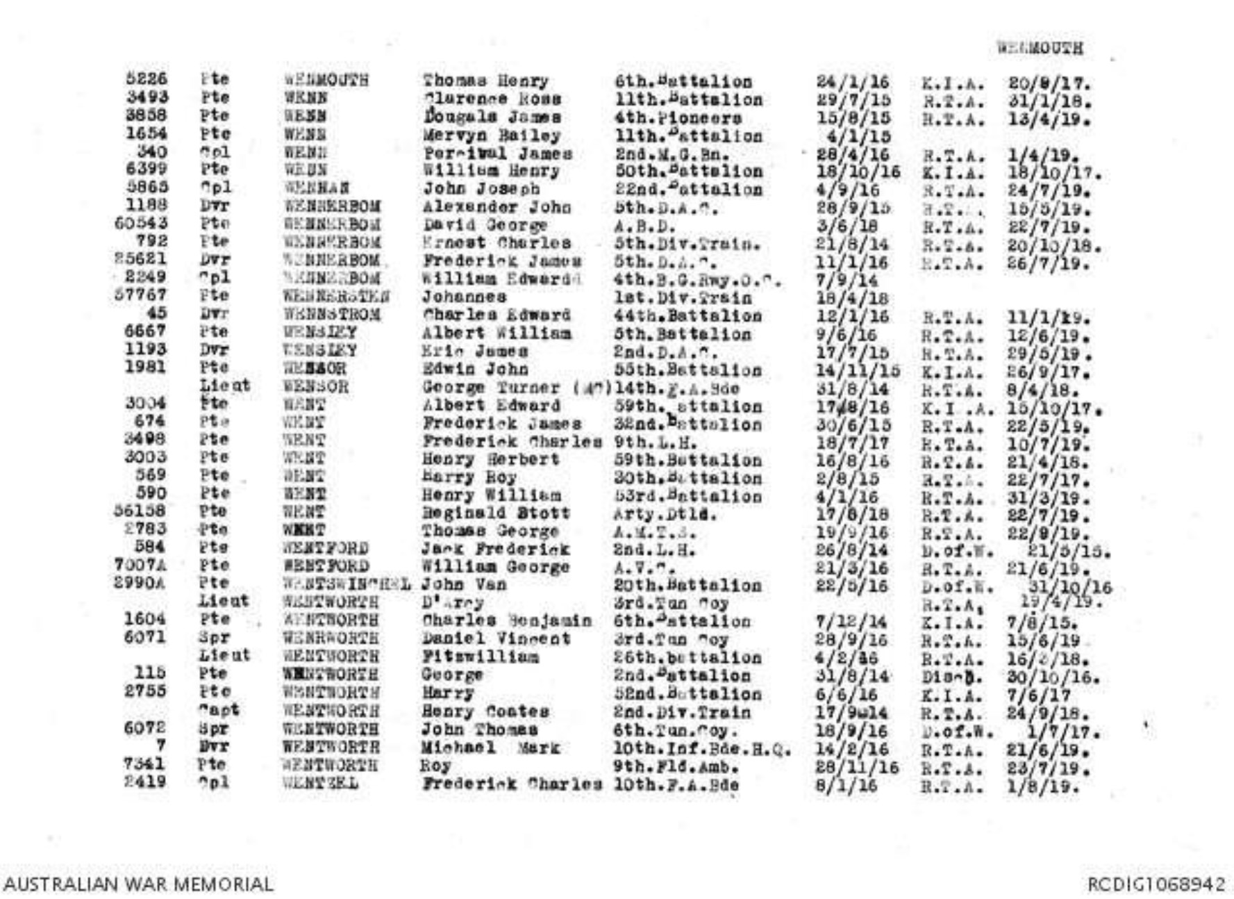 Record of Service of George Turner Wensor.