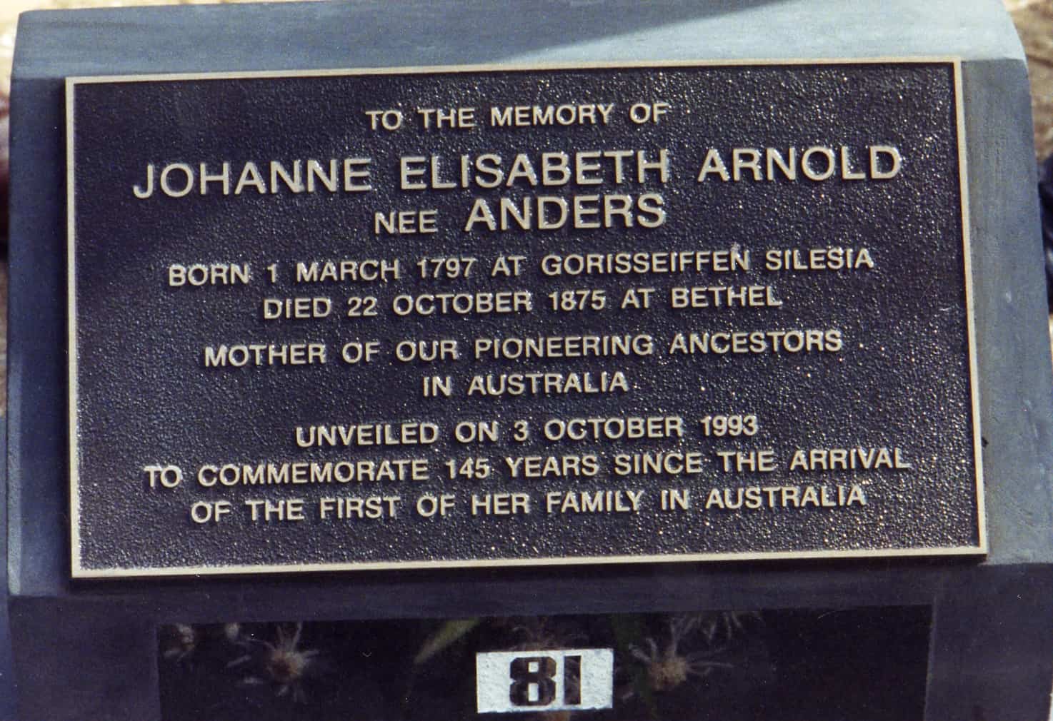 Reunion-1993-Plaque-at-grave-of-matriarch-Johanna-Elisabeth-Arnold-at-Bethel-Lutheran-Church-Cemetery.