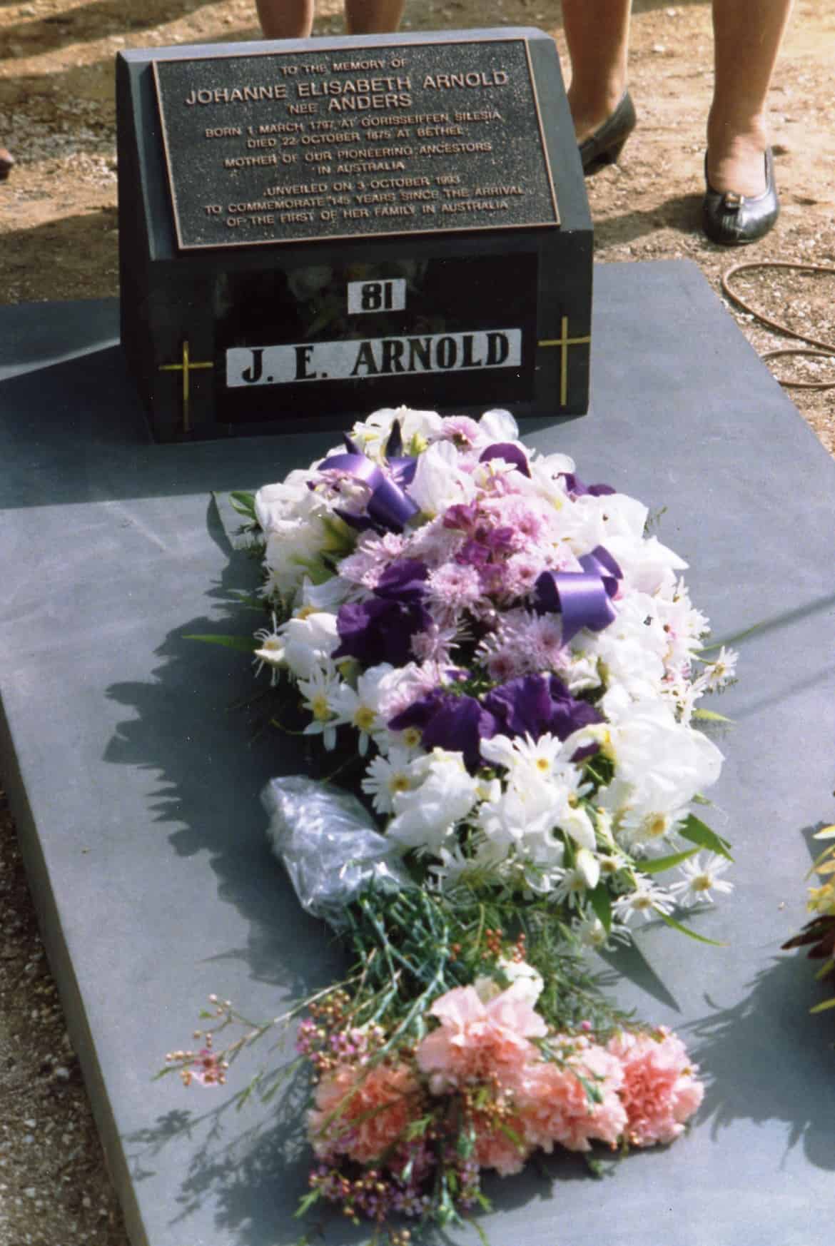 Reunion-1993-Plaque-flowers-on-Johanne-Elisabeth-Arnolds-grave-at-Bethel.